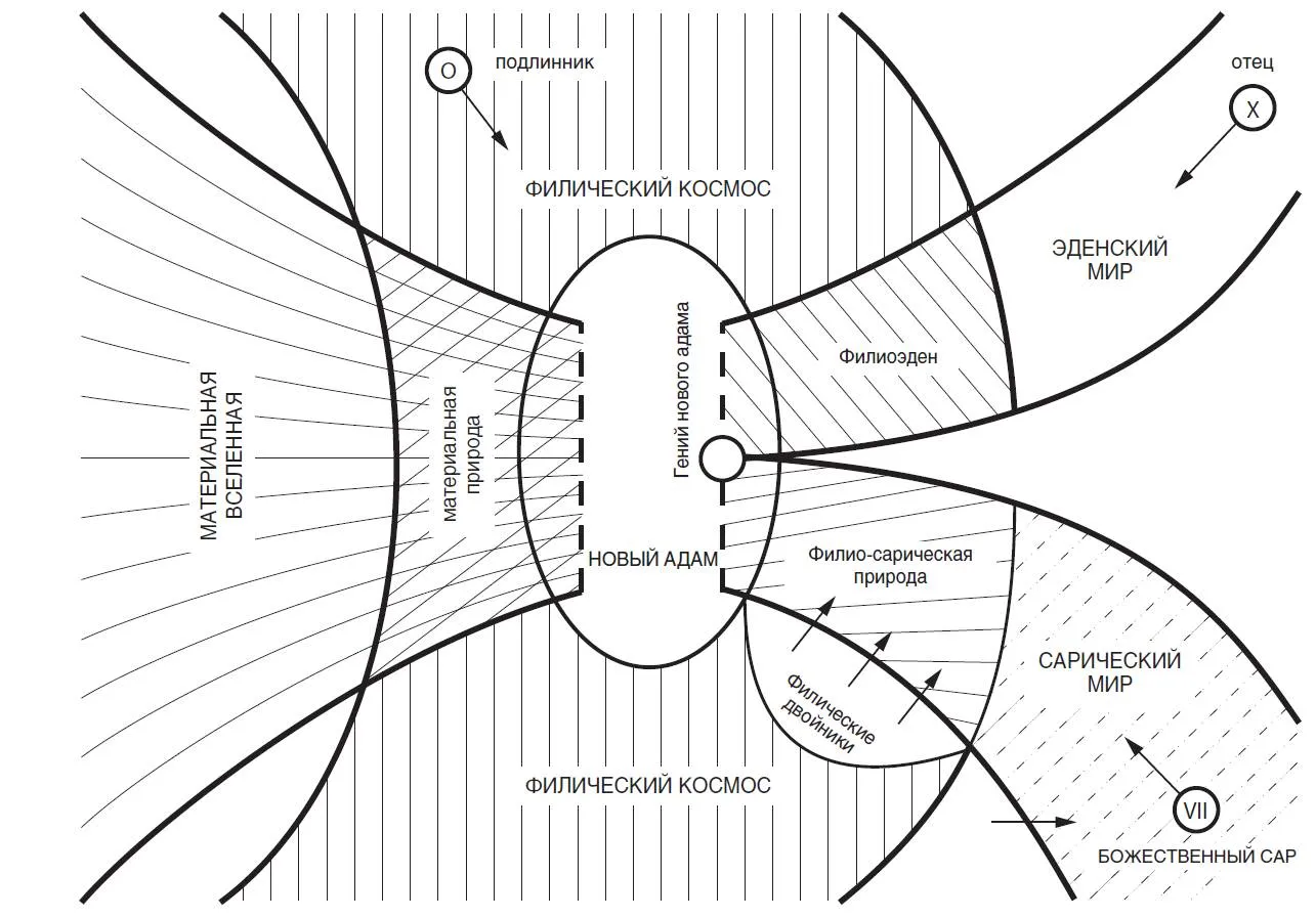 Репродукционная система Бога ОДИНОКОГО состоит из материальной Вселенной, Триады Божественных Лиц, филического Космоса Подлинника, эденского мира Отца и сарического мира Божественного Сара.