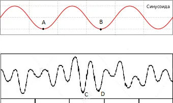 «Всё в этой реальности является синусоидной волной. Длина волны и её рисунок – вот что отличает одну вещь от другой. Длина волны – это протяжённость от любой точки на кривой до точки, где цикл кривизны заканчивается и начинается следующий цикл, как от точки А до точки В на более длинной волне или от точки С до точки D – на более короткой. Любой объект можно рассматривать как состоящий из мельчайших частиц, подобных атомам, а можно как волну» [3].
