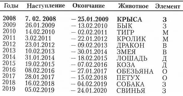 Примечание: линейками отделены циклы в последней колонке сопутствующие элементы обозначены буквами: В – Вода; Д – Дерево; О – Огонь; З – Земля; М – Металл.