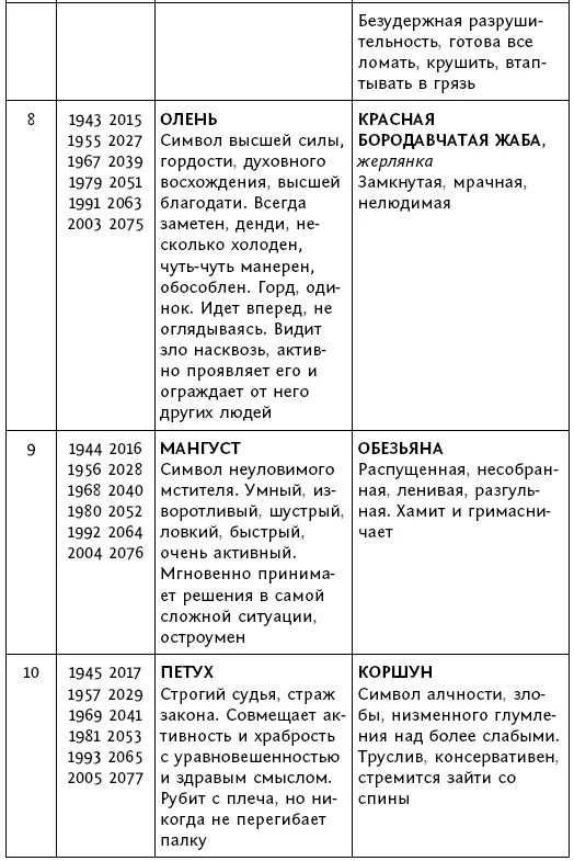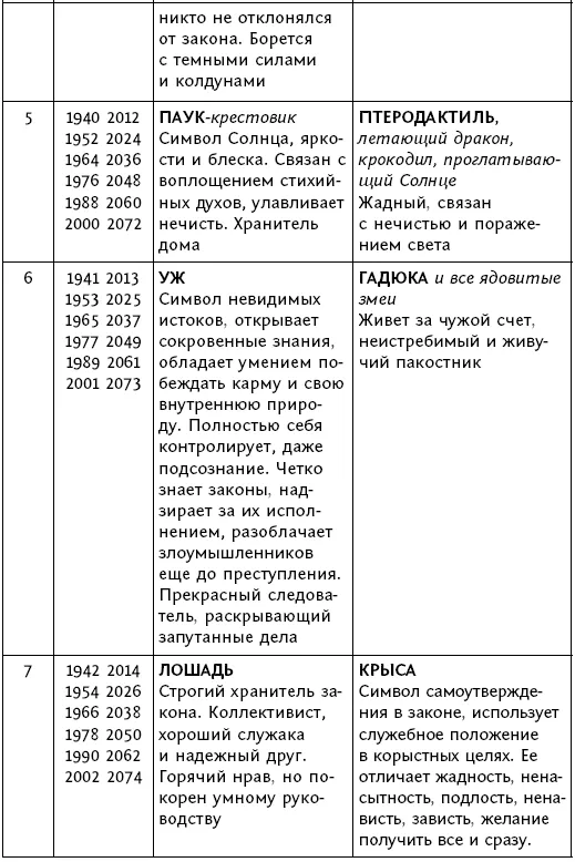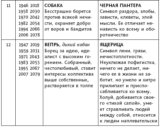 За 60-летний цикл восточного лунного календаря круг животных года повторяется пять раз. В нем отражается чередование влияния на нашу жизнь пяти стихий-первоэлементов природы: Дерева, Огня, Земли, Металла и Воды.