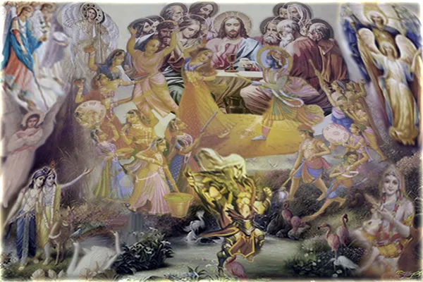 Благословенные Великие души зрели Трансцендентную Обитель Господа, сотканную из волшебного философского камня, превращающего железо в золото. Из земли философского камня построены и все дома, окруженные шелестящими древами желаний, и исполняющих любое пожелание. А в глубине Священного леса изумленному взору предстает инкрустированный драгоценными каменьями храм. И там под деревом желаний на прекрасном золотом троне с драгоценным основанием и украшенном самоцветными каменьями, восседает Сам Господь со Своей прекрасной и верной Супругой. От трансцендентного тела Господа исходит сверкающее сияние Нирваны, которое называют бесформенным имперсональным Брахманом [2, с. 548].