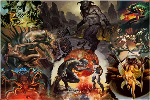 Античеловечество состоит, в основном, из двух рас, весьма отличных друг от друга. Главнейшие из них мелкие, но высоко разумные существа, двигающиеся по кругу перевоплощений и принимающие форму, несколько напоминающую нашу. Они обладают парой верхних и парой нижних конечностей, хотя и с иным, чем у нас, числом пальцев. Кроме того, они снабжены чем – то вроде кожных летательных перепонок. Их красные стебельчатые глаза, выдающиеся по сторонам цилиндрической головы, мышино – серая кожа и вытянутый трубкообразный рот могли бы вызвать в человеке отвращение. Но эти существа – обладатели острого интеллекта, создатели высокой цивилизации и в некоторых отношениях опередившей нашу. Они называются игвами. Воспринимают они весь мир перевернуто, под демоническим углом зрения. Однако кроме игв здесь существуют еще и аборигены этого перевернутого мира – раругги, которые напоминают кентавров и, отчасти, ангелов мрака, а может и мезозойских ящеров, поднявшихся в воздух. Крылья раруггов могучи и выпрямлены по сторонам непомерно огромного тела. За истекшие миллионы лет они достигли ступени разумности, но далекой от изощренного интеллектуализма игв. Но благодаря их телесной мощи, а также их невероятному эмоциональному накалу их жизни и борьбы за этот слой бытия игвы принуждены были примириться с тесным соседством раруггов и использовании их нечто вроде разумной конницы шрастров, их армия. Сами игвы участвуют в войнах лишь в крайнем случае и доминируют в качестве руководства [31, с. 85 … 87].