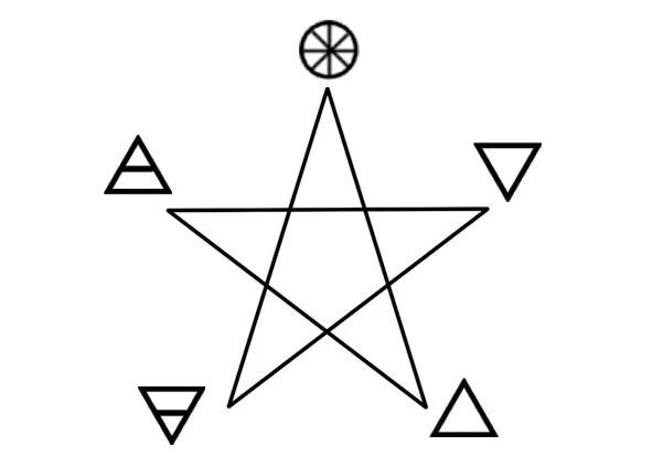 Каждый луч Пентаграммы соответствует одной из Стихий, они идут по часовой стрелке в описанном выше порядке, начинающемся с Воздуха, а верхний луч – это Дух, то, что выше остальных Стихий и не относится к ним (рисунок 2). Таким образом, Пентаграмма – это символ Духа над материальным миром, состоящим из четырех Стихий. А перевернутая Пентаграмма, вопреки расхожему мнению, это символ нисхождение Духа в материю, а вовсе не сатанизм. Именно поэтому ее порой рисуют на христианских храмах, иконах, витражах – в этом символе высший, божественный Дух спускается в материальный мир.