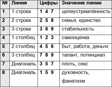 Анализировать психоматрицу, как мы это делаем для конкретных людей, в данном случае нельзя, так как рассматривается общее понятие, а не конкретный человек. Однако, мы можем провести исследование линий, которые отражают качества, позволяющие нам определить и выделить этапы развития ребёнка (человека), получающего данное имя. Чтобы не листать книгу, ещё раз напомним значения линий в матрице.