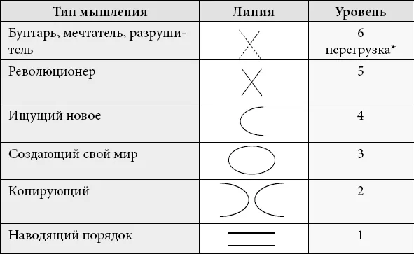 Для того чтобы упростить графический метод, а также провести исследование различных типов мышления в сравнении их между собой по уровню использования новых идей в каждом типе, мы с вами используем шкалу уровней новых идей в соответствии с типами мышления, что, в свою очередь, позволит нам ввести графический метод исследования различных дат по типу мышления.