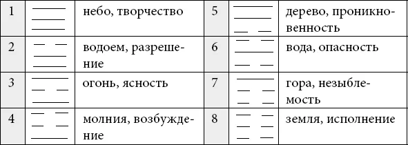 Существует всего восемь триграмм. Объединим их в таблицу с соответствующими названиями.