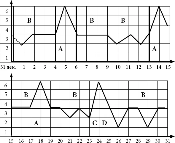 Однако праздники проходят, а мнимые планы остаются, как и мечты, которые еще долго не дадут жить спокойно. Отрезвление реальной жизнью придет только с 24 января, и лучше использовать последнюю неделю месяца с пользой. Обратите внимание, что с 25 по 31 января возникает волна с 3 по уровень 1, которая в данной ситуации может означать только одно – время двойной проверки планов на год. Необходимо тщательно пересмотреть свои планы и заранее освободиться от самых нереальных с точки зрения мечтания и наиболее опасных с точки зрения разрушения.