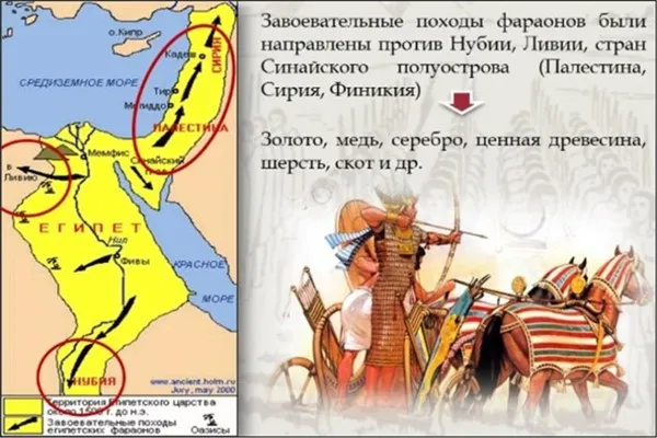 При его наследнике Аменхетепе I (серед. XVI в. до н. э.) Северная Эфиопия выделяется в особое наместничество. Войска существенно усилились. Появились конница и боевые колесницы, более мощный составной слоеный лук со стрелами с медными наконечниками, в качестве добавочного оружия секиры с короткими мечами у копейщиков, рубящий, а не только колющий, как старые кинжалы, меч (прямой и серповидный). Броня была известна уже с XVIII династии. Основателем «мировой» по тому времени Египетской державы явился зять и преемник Аменхетепа I – Тутмос I (втор. полов. XVI в. до н. э.). На юге он продвинул границу за третьи пороги. С середины XVIII династии с начала XV в. до н. э. фараон Тутмос III совершил 15 походов, пройдя по Палестине, Сирии и достигнув Евфрата, по пути разгромив войска мощного государства Северного Двуречья Митанни (притязавшего на север Сирии). После 54-летнего царствования Тутмоса III на престол вступил его сын Аменхетеп II. Он яростно рыскал по Сирии и Палестине в поисках добычи и для подавления «мятежей», угнал 100000 воинов и мирных жителей в рабство, убил 7 правителей. Напуганные цари малоазийских хеттов, Вавилона и даже Митанни присылали Аменхетепу дары. Его сын Тутмос IV еще ходил в Сирию и Палестину, но сблизился с Митанни, женившись на митаннийской царевне. Он и его преемник Аменхетеп III подавляли восстания в Эфиопии. Походов в замиренные Сирию и Палестину больше не было. Вавилонский и митаннийский цари слали «брату» своих царевен, не получив из Египта ни одной царской дочери. Новоегипетская держава стояла на вершине своего могущества.