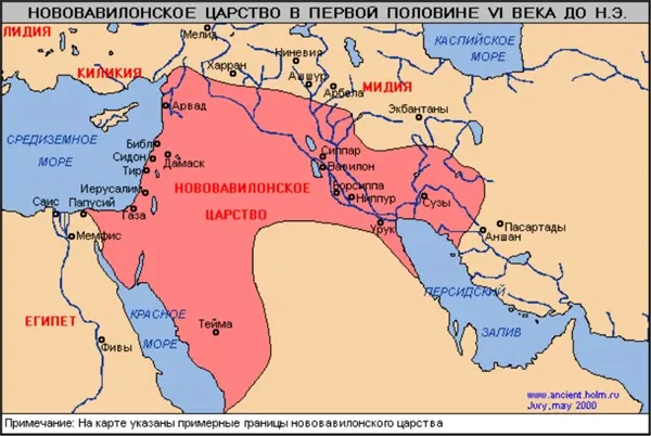 По-видимому, все они возлагали надежды на назревавший конфликт между Мидией и Вавилонией. Но Мидия до 590 г. до н. э. была занята ликвидацией Урартского и Скифского царств, а после этого оказалась вовлеченной в длительную войну с Лидией. В 587 г. до н. э. Навуходоносор II вновь появился в Сирии, Априй отступил, оставив Иудею на произвол судьбы. После полуторагодичной осады Иерусалима Цидкия попался вавилонянам во время неудачной вылазки. Ему выкололи глаза и отправили в Вавилонию. В 586 г. до н. э. Иерусалим был взят, разрушен и ограблен. Значительная часть населения, в первую очередь знать и ремесленники, была переселена в Вавилонию. Земли переселенных раздали оставшимся жителям. Последние иудейские бойцы отошли с женами и детьми на египетскую территорию. Длительная осада Тира не дала Навуходоносору II решительных результатов. В 597 г. до н. э. пришли к компромиссу: царь Тира Итобаал III признал верховенство Навуходоносора II, но Тир сохранил самоуправление. Заиорданские царства признали власть Вавилонии и расширили свои владения за счет Иудеи. Столица Навуходоносора II вновь стала ведущим городом Ближнего Востока, процветающим и многонациональным. Навуходоносор, называемый в Библии «царем халдеев», был женат на Амитис – дочери Мидийского царя Киаксара, для которой он приказал построить знаменитые «висячие сады Семирамиды», называемые древними греками одним из семи «чудес света»; название садов ошибочно закрепилось за ассирийской царицей Семирамидой, жившей двумя веками ранее.