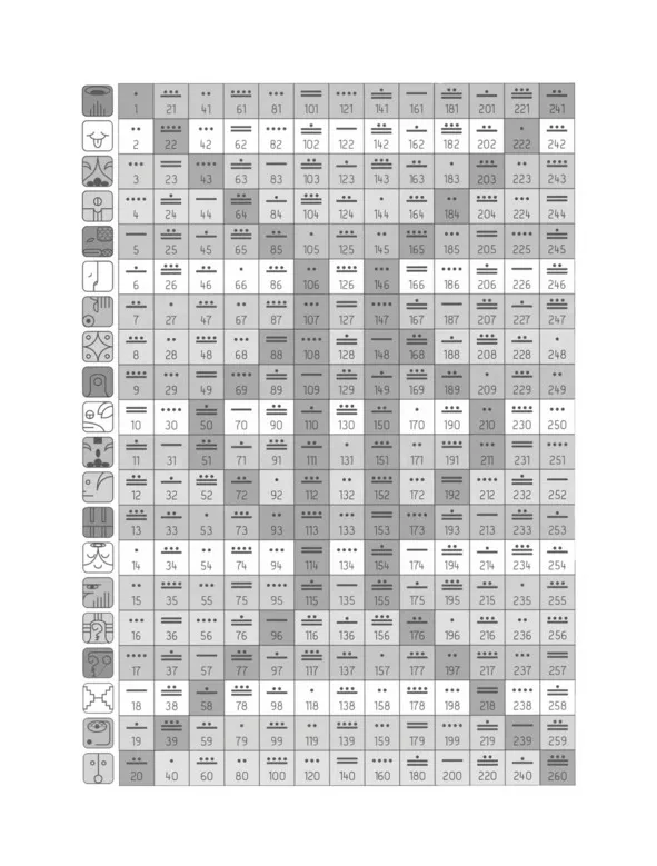 Календарь Цолькин состоит из 13 вертикальных столбцов, которые имеют точечно-черточное обозначение. Одна точка – 1, две точки – 2, три точки – 3, четыре точки – 4. Одна полоска – 5, две полоски – 10.
