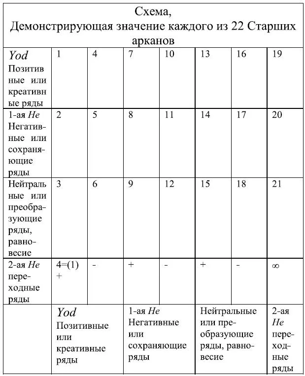 Таким образом три первых аркана определяют смысл всех других, согласно следующей таблице: