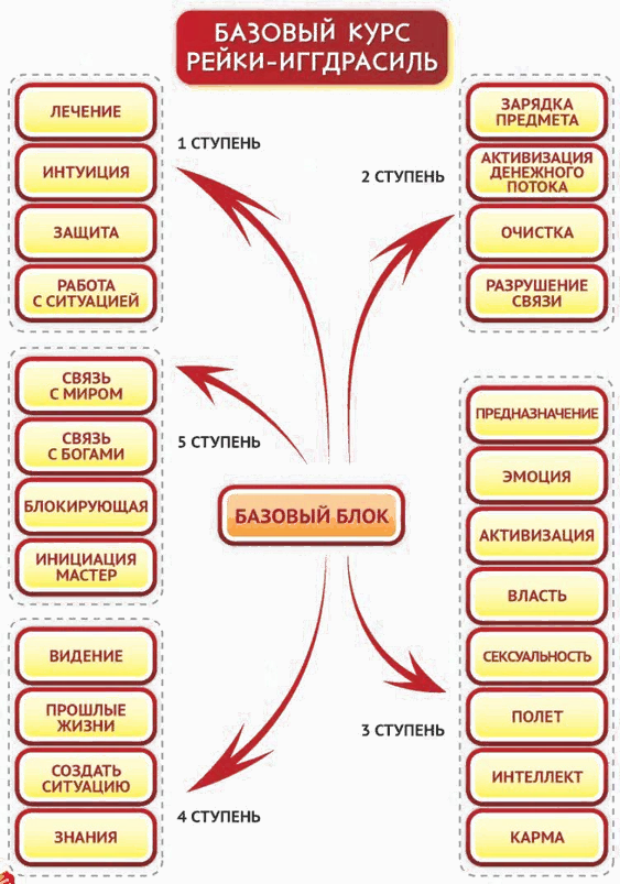 Базовый курс «Рейки-Иггдрасиль» содержит 5 ступеней, пройти его можно за 5 недель (одна ступень – одна неделя). По завершении работы с 5-й ступенью выдаётся диплом Мастера системы «Рейки-Иггдрасиль».
