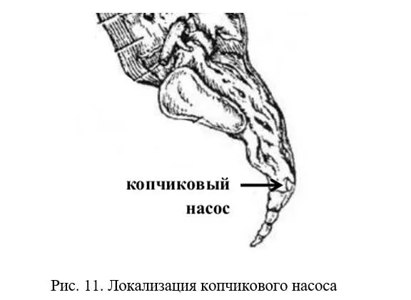 В даосских системах духовного и физического совершенствования область соединения крестца с копчиком представляется насосом, пропускающим сексуальную энергию яичников у женщин и яичек – у мужчин. Он является некой станцией, поднимающей вверх по позвоночнику к макушке циркулирующую внутри тела энергию. Даосы считали, что, проходя через копчиковый насос, сексуальная энергия цзин трансформируется в энергию жизненной силы ци. Открывая его, мы очищаем энергию и направляем чистую ци в каналы нашего тела для оздоровления.