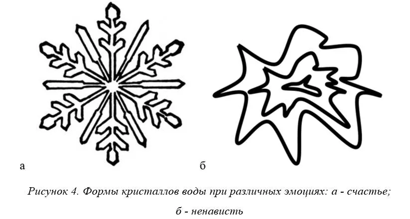 Полученные кристаллы соответствовали реакции воды на вибрации мысли, а их форма зависела от направленности эмоций. Оказалось: если воде передавались счастье и радость, то она, застывая, приобретала вид красивых и сказочных форм. И, наоборот, ненависть и злость формировали уродливые кристаллы (рисунок 4).