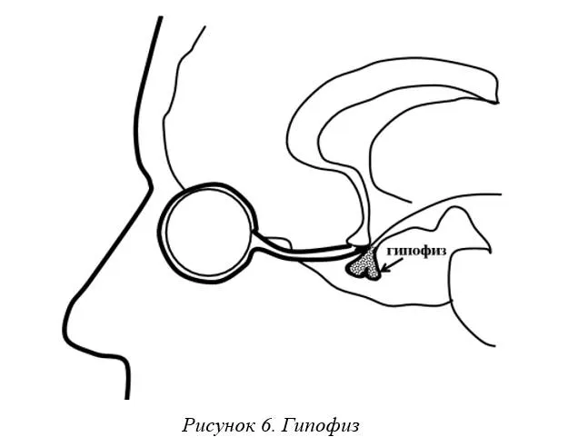 7 – Межбровье (интан). Хрустальный зал, чакра «третьего глаза» – центр высшей интуиции и творчества (синяя). Расположена на лбу между бровями. С этой точкой соотносится управляющий цент эндокринной системы – гипофиз («хрустальный дворец»). Он находится внутри черепа, приблизительно в 8 см от переносицы (рисунок 6). Когда точка гипофиза открыта, человек ощущает себя мудрым, если закрыта – он не способен к принятию решений.