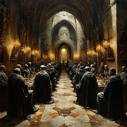 Я зашёл внутрь и проследовал за ним. Мы поднялись по лестнице и вошли в небольшой зал. Посреди стоял круглый стол, на котором во всю его поверхность была изображена шестигранная звезда. В центре неё стоял стеклянный шар размером с арбуз, а вокруг него расставлены шесть горящих свечей. Напротив каждого луча звезды располагались стулья, которые занимали разные люди: четверо мужчин статусом не ниже лорда и одна леди почтенного возраста. Перстень, как у меня, я разглядел только у одного участника, а значит, он и есть сер Уильям. Один стул пустовал. Похоже, он предназначался мне.