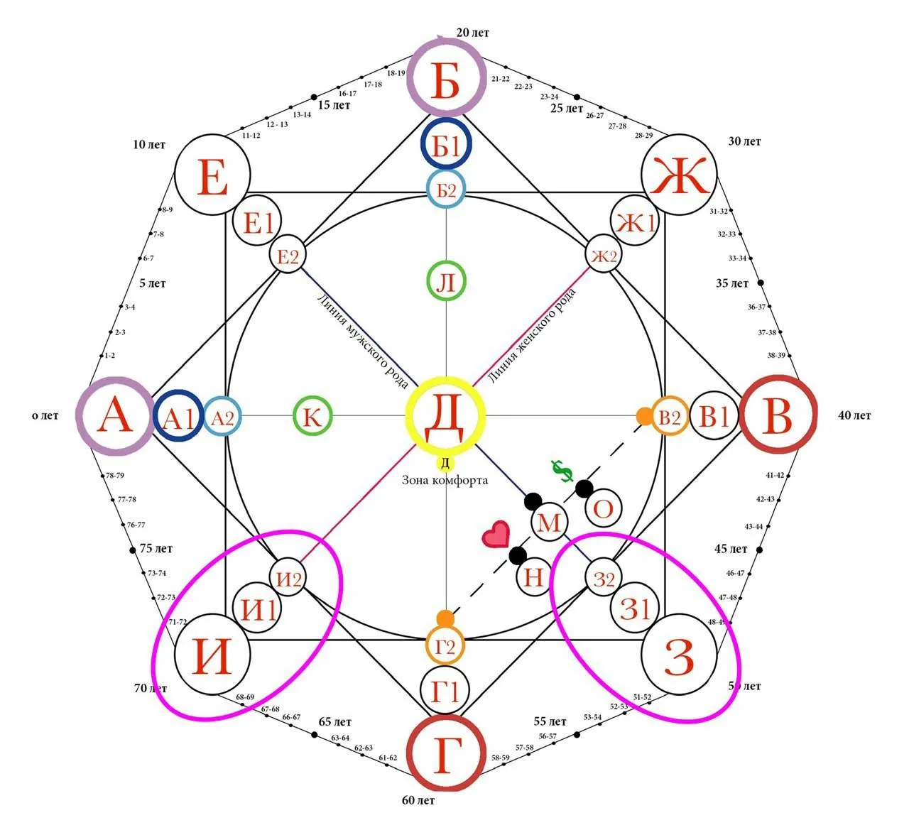 Точка Ж2 – талант рода матери, наработанный предками и переданный ребенку для раскрытия своего собственного таланта (точка Б2)