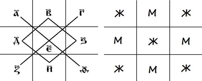 Для того, чтобы изобразить данное деление схематично, нужно соединить между собой мужские и женские знаки линиями, в результате получится рисунок похожий на один из древних славянских символов «Поле» или «Засеянное поле».