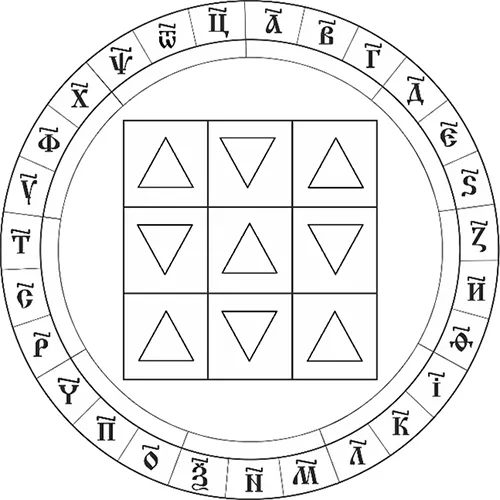Вернёмся к изображению натальной карты. Мы уже сказали, что, изображая натальную карту было бы точнее изобразить не девять квадратов, а девять треугольников, причём пять женских, или подвижных, или нечётных, треугольников мы должны изобразить отлично от четырёх мужских, чётных или фиксированных. Давайте изобразим пять женских треугольников остриём вверх, а основанием вниз, а мужские наоборот – остриём вниз, а основание вверх. Почему так?