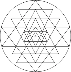 Интересно, что существует два варианта построения Шри Янтры. Первый вариант, описанный выше, состоит из пяти треугольников, обращенных вверх, и четырёх – вниз – его называют янтрой развития. Здесь всё просто: в янтре развития женских (материальных, подвижных) треугольников больше, чем мужских (духовных, фиксированных). И наоборот – второй вариант состоит из пяти мужских треугольников и четырёх женских. Этот вариант называют янтрой исчезновения, или разрушения. Соответственно, совмещённый рисунок Шри Янтры созидания и разрушения может выглядеть зеркальное отображение янтры, где янтра разрушения будет вверху, а янтра созидания – вверху. Хотя понятия “созидание” и “разрушение” не совсем полно отражают суть, здесь уместней говорить о янтрах материального и нематериального миров.
