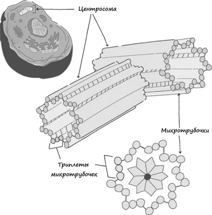 Здесь нужно сосредоточить своё внимание. Центросома – царь клетки, состоит из двух параллельных структур, образованных девятью триплетами (9 на 3 равно 27). Это удивительный факт, указывающий на то, что структура русского языка организована по подобию центросомы. Более того, Русская астрология также, как и русский язык один в один повторяет структуру царя клетки. Но и это не всё! Структура Великой Янтры, или космического яйца, или инфлатона, или кротовой норы также подобны строению центросомы.