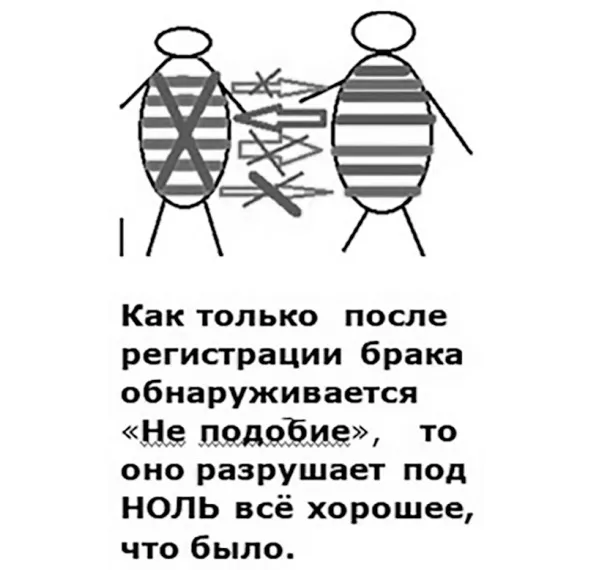 Пример: разрежьте много яблок по половинкам. Перемешайте их. А теперь, попробуйте соединить две половинки. Вы получите целое яблоко? – Вроде бы, да. Но, всмотритесь и увидите, что половинки разные. Целого яблока не получается. Чтобы было целое яблоко, нужно найти его родную половинку – из всей кучи половинок разных яблок. Вот когда вы её отыщете и соедините, вы увидите, что яблоко действительно гармонично и красиво.