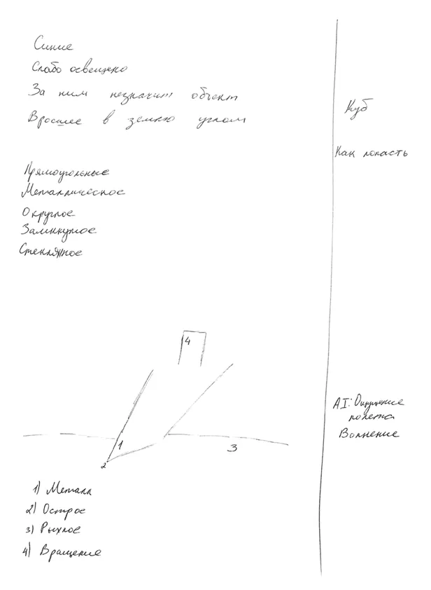 Потом мне почувствовалось, что там есть какая-то штучка, я ее дорисовал: какой-то прямоугольничек, что он как-то вращается. Я его промаркировал четвертым пунктом и отметил «вращение». Вот это зарисованный скетч с маркировкой. Что-то пришло – промаркировали, из чего состоит. Ага, это мягкое, упругое, серое, пирамидальное, острое, тупое, горячее. Можете там записать все что угодно.