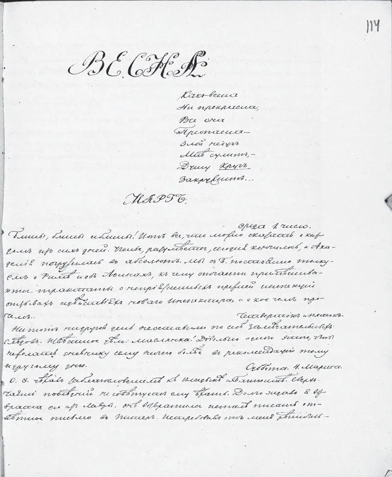Блины, блины и блины! Вот все, что можно сказать о каждом из сих дней. Ученье, разумеется, сегодня кончилось, и академия погрузилась в абсолют. Мы с батюшкой{58} постоянно толкуем о Риме и об Афинах, к чему отчасти примешиваются трактаты о неприязненных прежней инспекции отзывах и действиях нового инспектора и о кое чем прочем…
