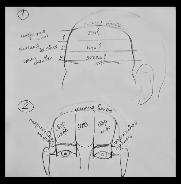 Следующая область на уровне глаз – сборка. На рисунке я указала как сбор информации. Человек способен переиначить информацию на свой лад. Экспериментальный подход. Так и рождаются новые открытия, течения и т. д. Например, мы знаем, что воду можно пить. Но человек с развитой сборкой докажет, что можно её испарять, замораживать, доводить до горячего состояния и прочее. Если сборка проявлена больше слева, то человек новатор в искусстве, философии и т. д. А справа – логика, математические изобретения. Но, в целом, зона сборки показывает потенциал, а будет ли человек использовать его – зависит от него.