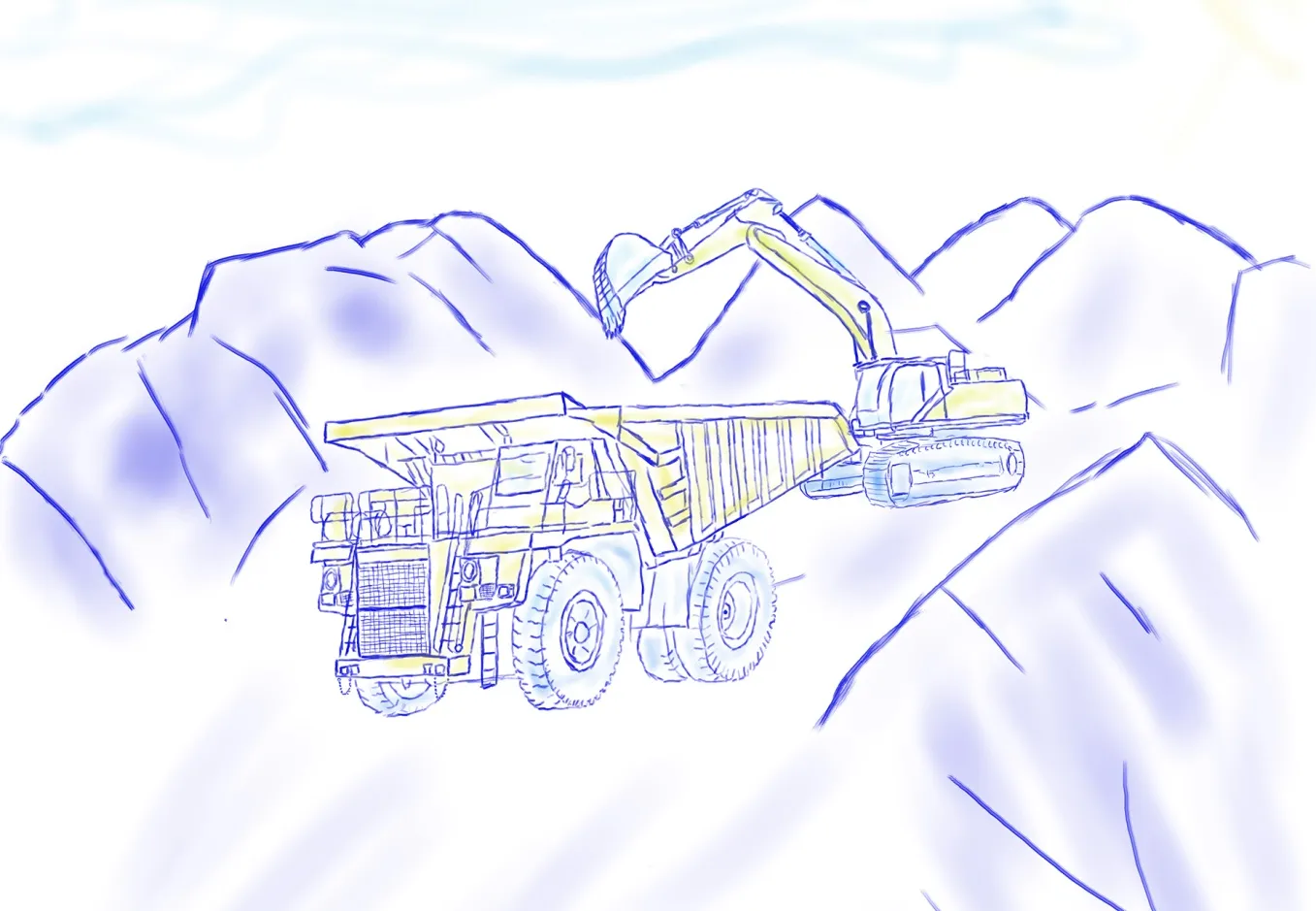 Я на краю очень глубокого карьера. Идёт погрузка БелАЗов большим экскаватором.