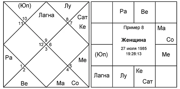 Благоприятно для благосостояния и образования. Такой человек накапливает богатство с помощью многих источников. Красивое лицо. Рожденный получает удовольствие от изысканных блюд и любит поесть, поэтому при таком положении есть вероятность лишнего веса. Немногословная, приятная и интересная речь. Даже находясь в падении во 2-м доме, Юпитер дает очень хорошие ораторские способности, но при влиянии, например, Марса или Раху, – любовь к нецензурной лексике. Красивая жена или муж, гармоничная семейная жизнь (если отсутствуют поражения малефиками).
