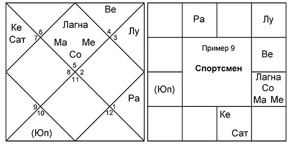 Вывод: большая сила воли и умение достигать успеха собственными усилиями. Юпитер в 6-м доме образует Нича-бханга раджа йогу и дает способность побеждать соперников. Управитель 11-го дома Меркурий сильный в 1-м доме, образует дхана и раджа-йоги. Перед нами действительно успешный спортсмен, занимающий призовые места на международных соревнованиях в зимних видах спорта.