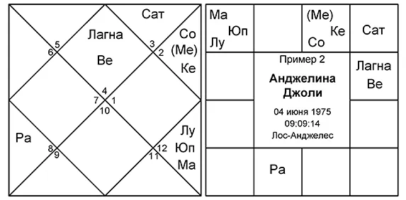 Пример 2: Анджелина Джоли – американская актриса, фотомодель. В ее карте мы видим влияние на лагну Венеры. Причем градусы Венеры (4 °39’ Рак) и градусы лагны (5 °27’ Рак) находятся в близком соединении – в пределах одного градуса, а, следовательно, Венера сильно влияет на 1-й дом, личность и внешность человека. Помимо Венеры на 1-й дом влияет сильный Юпитер из 9-го дома своим аспектом. Замечено, что одновременное влияние Юпитера и Венеры дает очень красивую и, как минимум, приятную внешность.