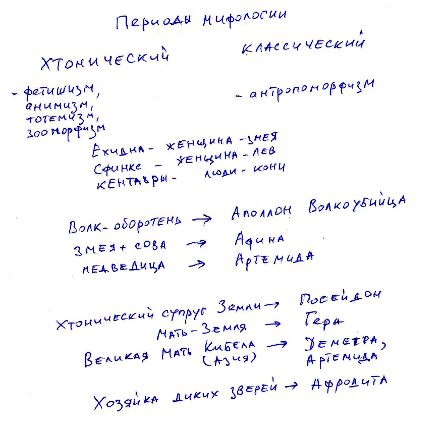 Итак, греческая мифология должна рассматриваться в своем развитии. А развитие ее, возможно, связано с ростом самосознания человека, с тем, что человек начинал лучше понимать природу и меньше ее бояться, к тому же он начал лучше понимать себя, что тоже немаловажно.