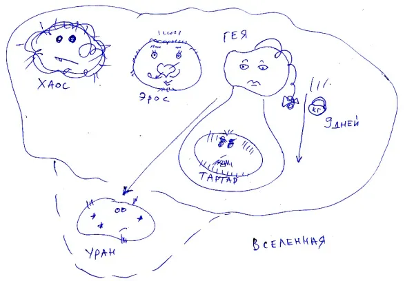 Изначально существовала некая неизвестная нам Вселенная, и по какой-то непонятной причине в ней зародились четыре великие силы. Хаос, Гея и Эрос нашли свое место в этой вселенной. Но вот Тартар почему-то оказался внутри Геи, очень-очень глубоко. Если бы мы случайно уронили туда медную наковальню, она бы летела до Тартара целых 9 дней. Сама я не пробовала, но доверилась Гесиоду.