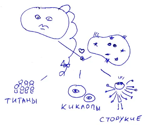 Гея родила от Урана титанов (Гипериона, Иапета, Койя, Крийя, Кроноса, Океана, Тейю, Тефию, Рею, Фемиду, Мнемозину и Фебу) и ужасных чудовищ – одноглазых киклопов (на надо путать их с циклопами, которых посетил герой Одиссей!) и сторуких гекатонхейров. Нежности киклопы и гекатонхейры у отца не вызывали, и он запер их в чреве Геи.