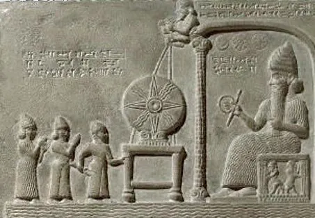 Шамаш (правиель Сиппара и Ларсы) и его солярный символ, в руке знак власти (из статьи Википедии «ШамашУту», Авторство: http://altreligion.about.com/library/graphics/bl_ashur.htm, Общественное достояние, https://commons.wikimedia.org/w/index.php?curid=2739443)
