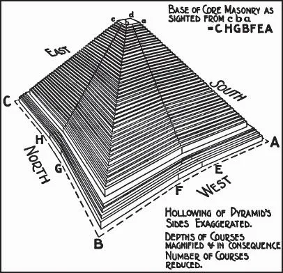 Это было обнаружено совершенно случайно в 1940 году, когда британский пилот военно-воздушных сил П. Гровс летел над пирамидой. Он случайно заметил вогнутость и зафиксировал её в ныне знаменитой фотографии. Эта странная особенность не была впервые обнаружена в 1940 году. Это было продемонстрировано в «Описании Египта» (Том V, пл. 8) (La Description de l’Egypte in the late 1700’s, Volume V, pi. 8) в конце 1700-х годов. Флиндерс Петри заметил опустошение в основной кладке в центре каждой грани и написал, что он «постоянно наблюдает, что эти провалы составляли от Vi° до 1°» (рис. 8).