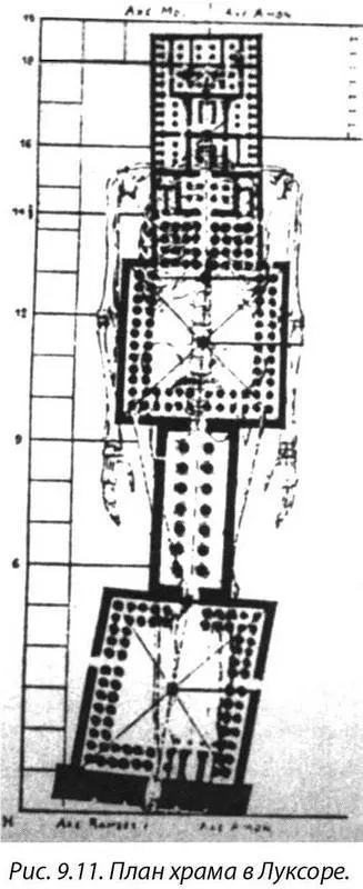 На рисунке 9.11 изображен план основания храма в Луксоре. Этот храм был посвящен человечеству, он так и называется – Храм Человека, следовательно, он возведен в честь нас – не какого-то отдельного человека, не просто какого-то уровня сознания, а именно в честь второго уровня, на котором мы находимся сейчас. План выполнен из 19 отделов. За этим рисунком вы можете видеть скелет человека. Каждое помещение храма было спроектировано так, чтобы представить разные части человеческого тела. Длинная, в несколько миль, дорожка, идущая от ступней, приводила к храмовому комплексу в Карнаке.