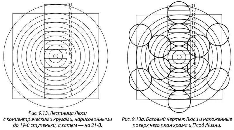 Но мне хотелось больше узнать о лестнице, идущей наверх, к 19-й и 21-й линиям. Мне было известно, что лестница подобного типа – это еще один способ создания концентрических кругов, поэтому я решил исследовать, что Люси делала с этой лестницей. Я начал перерисовывать каждую ее линию, чтобы увидеть, что же она пыталась сообщить (рис. 9.13). Я взял рисунок Плода Жизни и лестницы Люси (рис. 9.12 и 9.13), причем оба они явно получались из ее исходного рисунка, и объединил их. Я воссоздал ее рисунок, очень точно совмещая линии (рис. 9.13а).