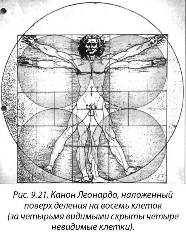 На рис. 9.21 вы видите деление на восемь клеток (см. Яйцо Жизни на рис. 7.26, т. 1), совмещенное с телом человека; перед вами действительные пропорции взрослого человека, содержащиеся в этом восьмиклеточном делении. (Позже в этой главе мы более детально обсудим взаимосвязь между каноном Леонардо и Яйцом Жизни.) Если Леонардо действительно это понимал, если это не было простым совпадением, то он говорил не о нас, а о первом уровне сознания – об аборигенах – первых людях мира. Конечно, я не знаю, понимал он это или нет, столь малого количества информации недостаточно, чтобы на нем основывать такое суждение.