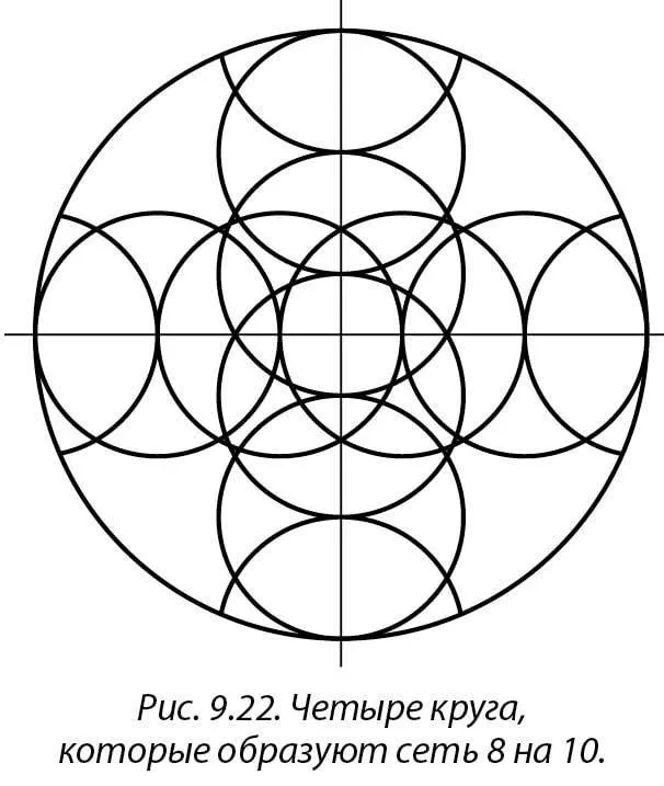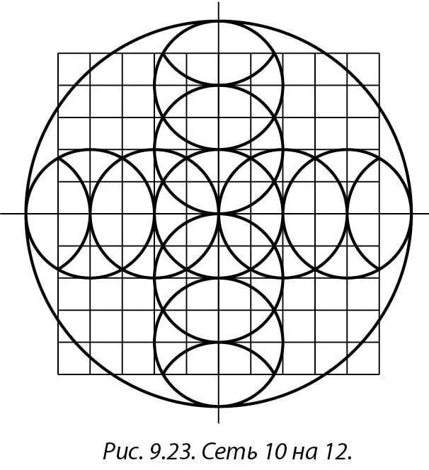 Если вы вместо четырех (как на рис. 9.22) начертите пять кругов одинакового диаметра вдоль осей (как на рис. 9.23) и проведете прямые через длины и точки касания всех Vesica Piscis, то получите сеть из 100 клеток – 10 на 12. Вы точно знаете, что это сеть 10 на 12, потому что большой квадрат составляют 10 клеток, а диаметр большого круга 12 клеток. Как мы видели на рис. 9.16, Vesica Piscis на четырех сторонах квадрата расположены наполовину внутри и наполовину снаружи него, поэтому половина ширины Vesica Piscis задает размеры клеток (вы провели линии через длины всех 12 Vesica Piscis и параллельные линии через все 10 точек их касания). Таким образом, вы получили совершенные пропорции.