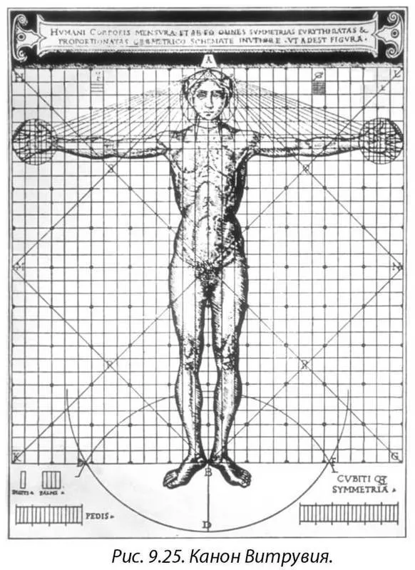 На рисунке 9.25 изображен канон Витрувия, то есть сеть 10 на 12. Когда вы впервые смотрите на него, в нем ничто не говорит о 10, поскольку в его стороне 30 клеток, или всего 900. Однако, посмотрев внимательно, вы увидите точки, отсчитывающие каждую третью клетку. И если вы пойдете от точки к точке, считая каждые три клетки за единицу, то получите ровно десять отрезков на сторону. Итак, в этой сети скрыто 100 более крупных клеток.