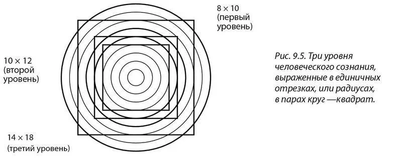Самый внутренний квадрат (четвертый) на рисунке 9.5 представляет первый уровень, средний квадрат (пятый) – второй уровень, а внешний (седьмой) – третий уровень. Внутренний квадрат я буду называть 8 на 10, подразумевая, что его сторона имеет восемь радиусов, а диаметр относящегося к нему круга (пятого) – десять. Сторона среднего квадрата равна 10, а шестого круга – 12, поэтому я называю их 10 на 12. Это средний, или второй, уровень, на котором мы существуем сейчас. Для уровня Сознания Христа соотношение такое: 14 радиусов поперек квадрата (седьмого) и 18 радиусов поперек девятого круга, другими словами 14 на 18. Итак, у нас есть 8 на 10, 10 на 12 и 14 на 18.