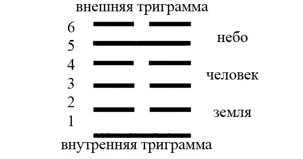 Линии гексаграммы нумеруются снизу вверх, от 1 до 6, и обычно 1 линия называется нижней или начальной, а 6 – верхней. Каждая гексаграмма состоит из двух триграмм, нижнюю называют внутренней, верхнюю – внешней (рис. 10).