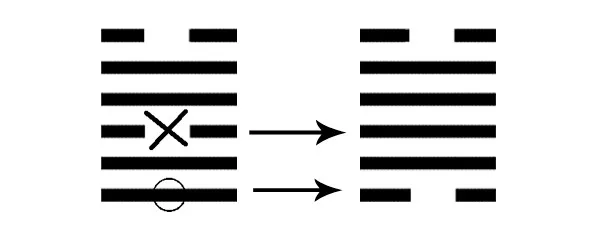Каждая гексаграмма может пребывать в состоянии перемен – а это значит, что она может изменяться, переходить из одного состояния в другое, и становиться новой гексаграммой. В этом случае Ян становится Инь, и, наоборот, Инь становится Ян. Линии меняются, и возникает новая гексаграмма, как результат происходящих перемен.