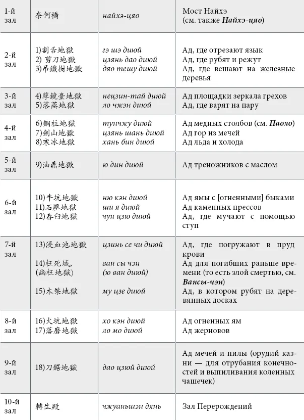 Существуют варианты организации адов, которые намеренно созданы, чтобы снять основные противоречия между системами Восемнадцати нараков и Десяти залов загробного суда. По этим версиям загробный суд тоже вершат десять Великих судей, однако в их подчинении оказывается другой набор адов, чем прежде. Судья первого зала заведует только мостом Найхэ (см. Найхэ-цяо), а судья последнего зала занимается только перерождениями. А в залах со второго по девятый располагаются восемнадцать адов. Однако список адов отличается от названий нараков, что видно на приведенном ниже одном из многочисленных вариантов. Кроме того, если раньше в распоряжении судей были довольно длинные списки грехов, за которые они судили души, то теперь в каждом из адов осталось только по одному «профильному» прегрешению.
