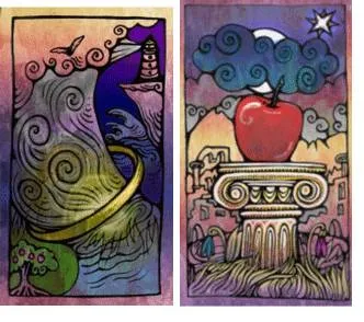Сосредоточьтесь на разрушенном городе на заднем плане, почувствуйте энергию разрушения. Эту энергию нужно направить сквозь кольцо, но прежде вам нужно убрать из нее один важный аспект. Сосредоточьтесь на яблоке, это негативное качество(а) вашей личности которое препятствует преобразованием вашей личности и духовному росту (самый простой пример – это лень). Выделите 1-3 качества и просто уберите яблоко из карты. Теперь энергию карты можно проводить через кольцо. Эта энергия разрушает или ослабляет препятствие.