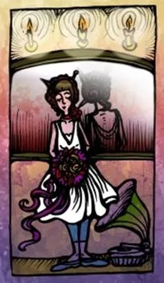 5. Но границу перехода из зеркала освещает три свечи. Свет стеной по зеркалу отсекает чужеродные негативные мысли. Если погаснет свеча, что произойдет? А если одна из трех? Понаблюдайте за всей картиной в целом. Что есть девушка, а что ее отражение? Что означают детали изображения, например, спицы, форма прически, лента на шее у девушки, ленты на букете?