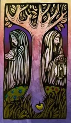 Посреди поляны ветвистое дерево. С разных его сторон мужчина и женщина. Женщина с книгой, мужчина с фонарем. На поляне цветы синие и красные. Под деревом зеленое яблоко.